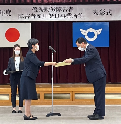 滋賀県庁にて、2022年9月16日に表彰式が開催され、高齢・障害・求職者雇用支援機構 滋賀支部長より表彰状と記念盾を頂戴しました。